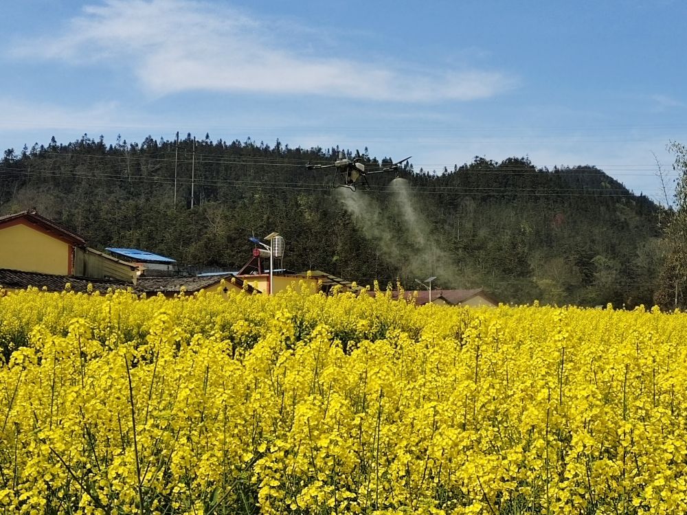 眼下,西部多地油菜进入盛花期,做好田间管理尤为重要。在云南省马关县夹寒箐镇上布高村,县农业农村和科学技术局高级农艺师李明兵和同事正操作着植保无人机,沿着设定路线进行飞防作业。无人机喷洒出雾状农药,为1500余亩金色的油菜花海布下一道科技感十足的“防护帘”。
