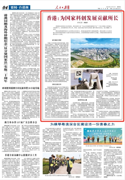 近年来,香港还与内地多个地区在科技领域进行深入合作,携手发展新质生产力。中关村科学城—香港创新加速器项目前不久在北京启动,这一由京港共同创设的国际化创新加速平台将助力北京科技企业落地香港和拓展国际市场,标志着京港科技创新合作迈出新步、更上层楼;香港科技大学上海产教融合中心近期正式落户上海,这是港科大首个位于长三角的产学研基地,未来将推动沪港高校、企业在科技创新方面的合作,更好实现成果的双向转化。
