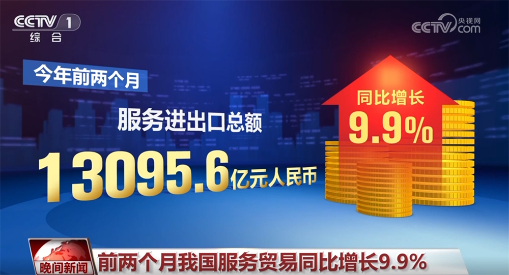 商务部最新数据显示,今年前两个月,我国服务贸易较快增长,服务进出口总额13095.6亿元人民币,同比增长9.9%。其中,出口5495.8亿元,增长13%;进口7599.8亿元,增长7.8%。