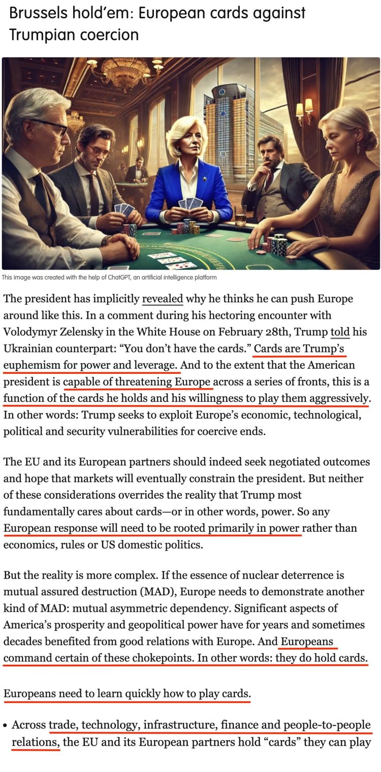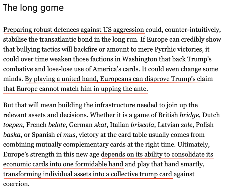 “通过团结一致,欧洲人可以有力驳斥特朗普关于欧洲无法与他匹敌的说法。最终,欧洲在这个新时代的实力取决于它能否明智而巧妙地整合并运用自己的筹码,将各成员国的资产转化为对抗美国胁迫的‘集体王牌’。”