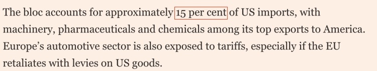 数据显示,欧盟对美出口约占美国进口总额的15%,其中汽车、机械、药品和化学品等是其主要输美产品。