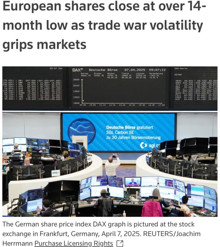 因投资者担忧美国“对等关税”加剧经济衰退风险,全球股市7日重演“黑色星期一”,欧洲三大股指当天全线下跌。