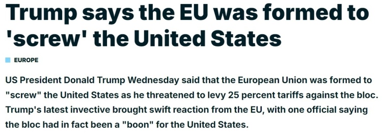 他一直指责欧盟给美国造成“数千亿美元”贸易赤字是一种“暴行”,甚至声称欧盟的成立初衷就是“坑害美国”。