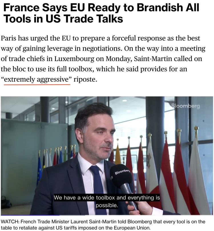 法国负责对外贸易的部长级代表洛朗·圣-马丁更是警告,欧盟对美国新关税政策的反击可能会“极为激烈”。