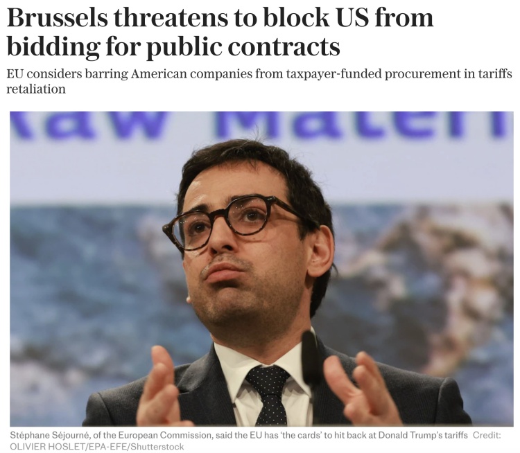 欧盟委员会执行副主席、法国前欧洲和外交部长塞茹尔内还对媒体透露,欧盟正考虑采取限制美国企业参与欧盟公共采购项目的手段回击美国新关税政策。