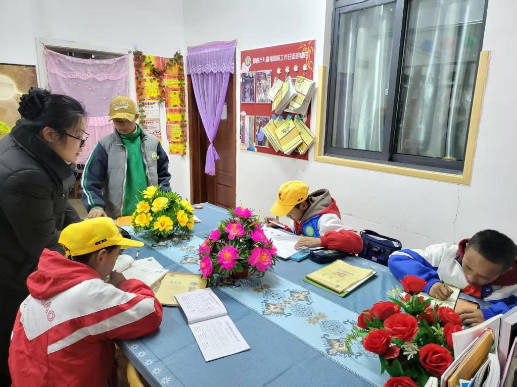 2025年3月17日,周雪在儿童福利院与放学回去的孩子谈心,了解他们在学校的情况。(受访者供图)
