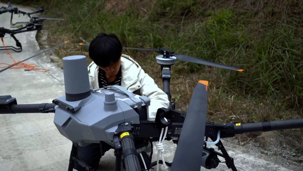 随着操作员推动拨杆,三台大型无人机快速飞向深沟里的竹林,不一会儿,成捆的竹材被吊运到了公路边。操作员介绍,一台无人机连续作业,在陡峭的山坡深谷,可节约人工成本70%以上。