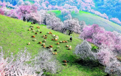 你且看伊犁河谷——蜿蜒的山坡披覆锦绣,层层叠叠的粉白自谷底漫卷山腰。风起时,花瓣簌簌飘落,远处的牧人勒马驻足。恍惚间,难辨是大地托起了云霞,还是云霞坠入了人间。