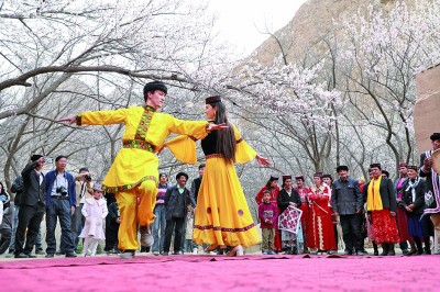 新疆阿克陶县塔尔乡塔吉克族民间艺人在杏花树下起舞。全文兵摄