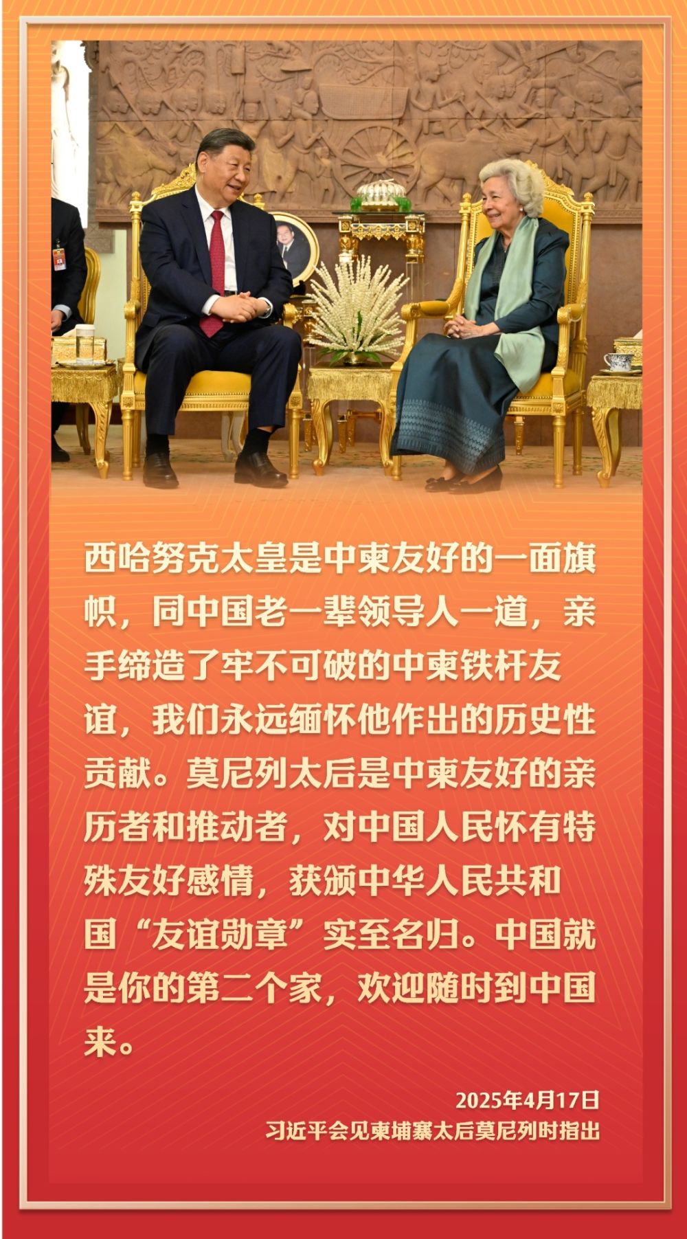 2016年10月13日,国家主席习近平在金边看望柬埔寨太后莫尼列。莫尼列太后特意请习近平在西哈努克太皇生前常坐的椅子上就座。