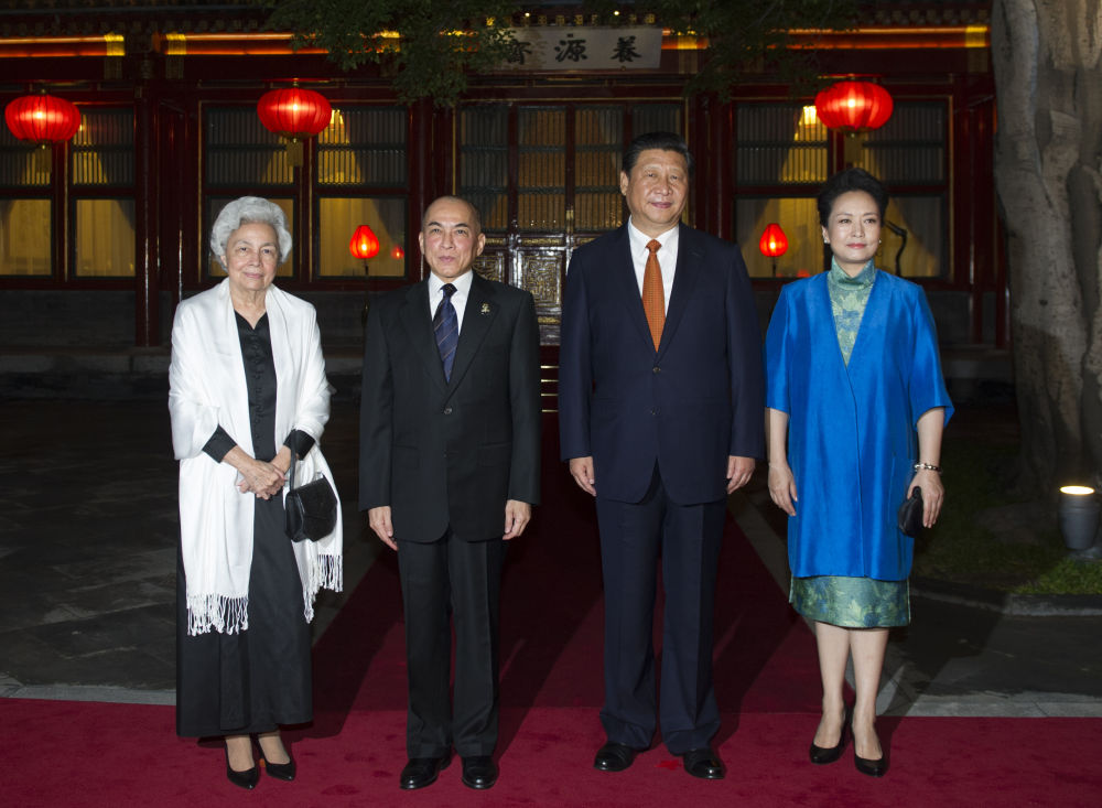 2014年9月25日晚,国家主席习近平在北京钓鱼台国宾馆会见柬埔寨国王西哈莫尼和太后莫尼列。习近平主席夫人彭丽媛参加会见。