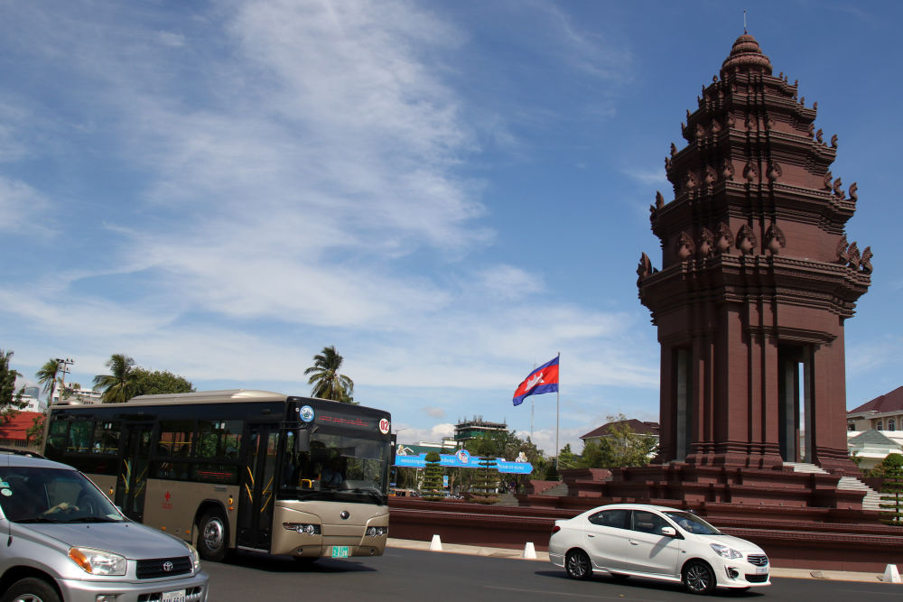 2018年1月5日,在柬埔寨金边,一辆中国援助的“宇通”公交车经过独立纪念碑。