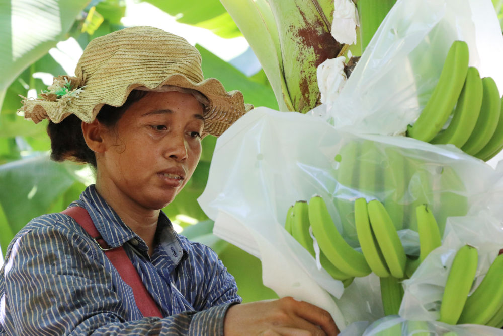 2020年7月17日,工人在柬埔寨桔井省的柬埔寨-中国热带生态农业合作示范区给香蕉套袋。
