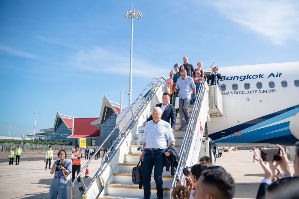 2023年10月16日,由中国企业在海外以“BOT模式(建设-运营-移交)”建设的柬埔寨暹粒吴哥国际机场通航运营。这是该机场首架进港客机乘客走下飞机。