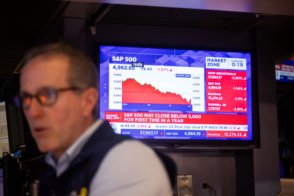 4月8日,交易员在美国纽约证券交易所交易大厅工作。纽约股市三大股指当天下跌。新华社发(郭克摄)