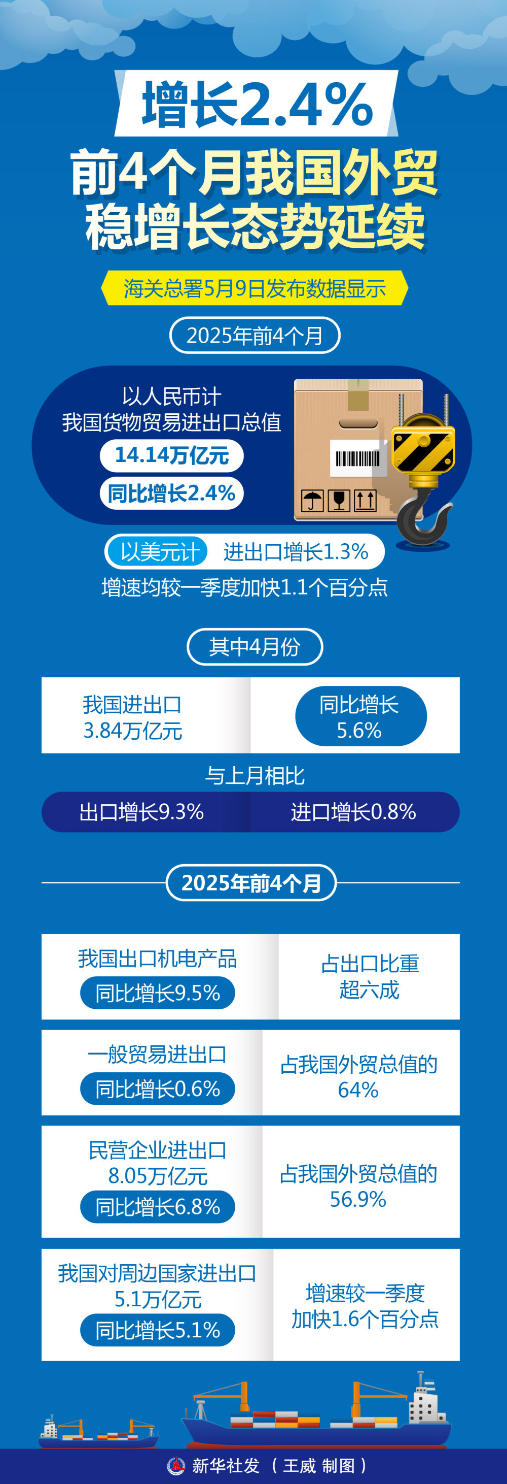 海关总署5月9日发布数据显示,2025年前4个月,以人民币计,我国货物贸易进出口总值14.14万亿元,同比增长2.4%,以美元计,进出口增长1.3%,增速均较一季度加快1.1个百分点。其中4月份,我国进出口3.84万亿元,同比增长5.6%。与上月相比,虽出口同比增速高位小幅回落至9.3%,但进口由降转为增长0.8%。