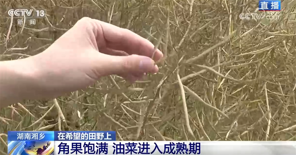 记者来到了湘潭湘乡市泉塘镇双江村,油菜现在长得怎么样了?油菜的顶端已经呈金黄色,角果很饱满,我们平时常说的油菜籽就藏在金黄色的角果里,这说明现在油菜已经进入成熟期了。