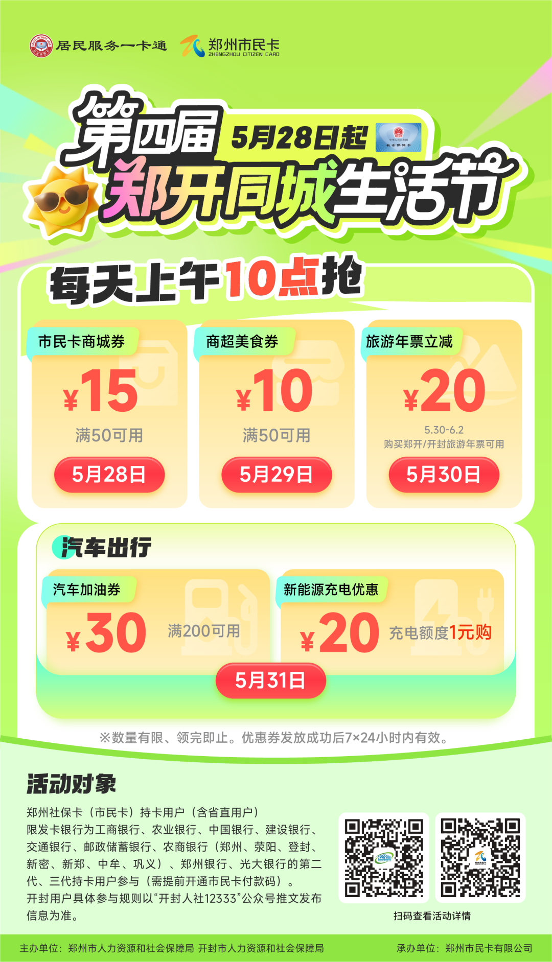 【大河财立方 记者 程帅星】5月27日,大河财立方记者从郑州市人社局获悉,5月28日上午10点,“第四届郑开同城生活节”将在郑州、开封两地同步开展。届时两地社保卡(含省直)持卡用户在郑州、开封超4000家商超、餐饮店、景区、加油站、充电站,以及市民卡商城,均有机会享受不同程度优惠。