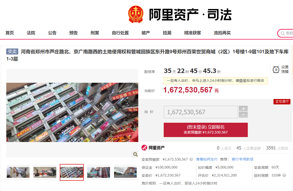 【大河财立方消息】7月8日消息,郑州百荣世贸C座及相关土地使用权在司法拍卖平台挂牌,起拍价16.7亿元。