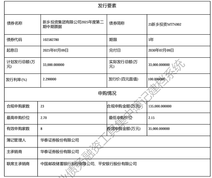 主承销商及簿记管理人为华泰证券,联席主承销商为中国邮政储蓄银行、平安银行。所募资金拟用于偿还“23新乡投资MTN004”本金。2025年6月25日,经联合资信综合评定,发行人主体信用评级为AA+,展望稳定。