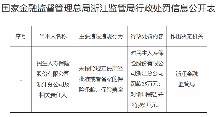 【大河财立方消息】7月22日消息,国家金融监督管理总局浙江监管局日前披露的行政处罚信息公开表显示,因未按照规定使用经批准或者备案的保险条款、保险费率,民生人寿保险股份有限公司浙江分公司被罚25万元。