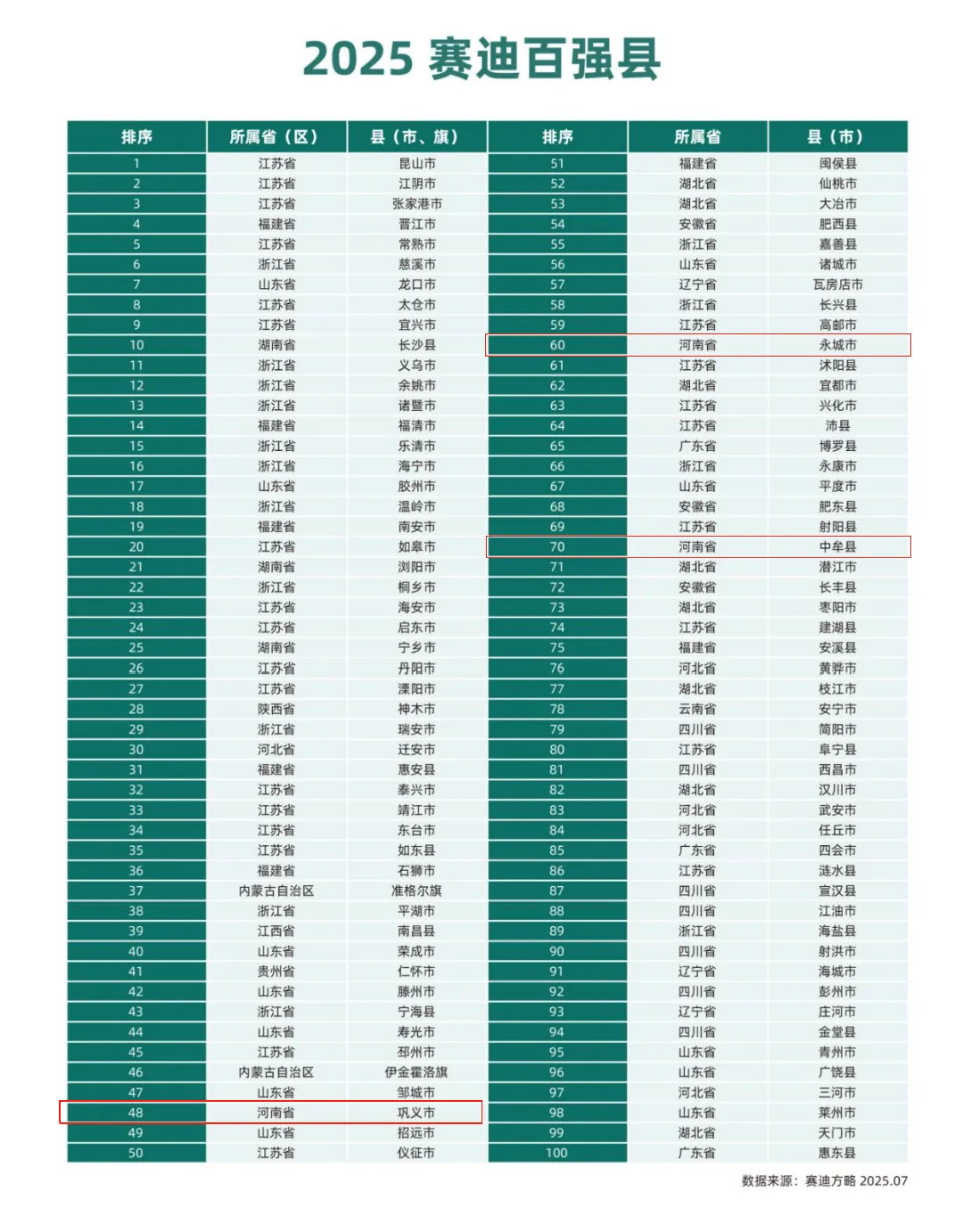 【大河财立方消息】7月23日,2025县域经济创新发展论坛在北京举行。赛迪顾问发布2025赛迪百强县市榜单。其中,河南3地上榜,包括:巩义市(48位)、永城市(60位)、中牟县(70位)。
