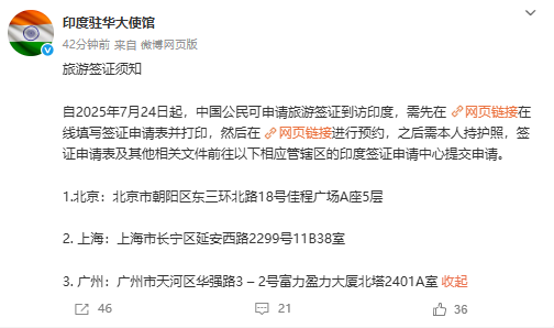 【大河财立方消息】7月23日,据印度驻华大使馆官方微博发布,自2025年7月24日起,中国公民可申请旅游签证到访印度。这是自2020年暂停后,印度时隔5年首次恢复向中国公民签发旅游签证。此前印度对中国公民赴印商务签证也有所限制,近期也得到了一定程度的放松。
