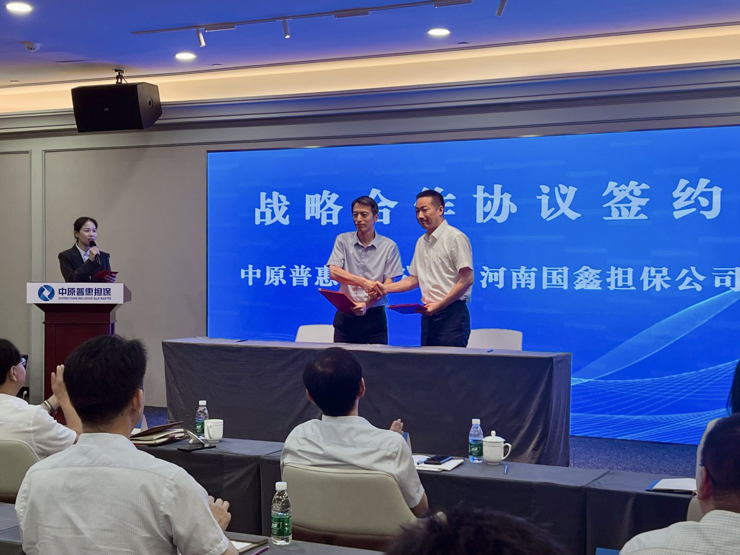 仪式现场,中原普惠担保公司董事长兼总经理冉华强与河南国鑫担保总经理李飞飞签署业务合作协议。同时,中原普惠担保还与中国银行洛阳分行等8家银行机构签署合作协议。