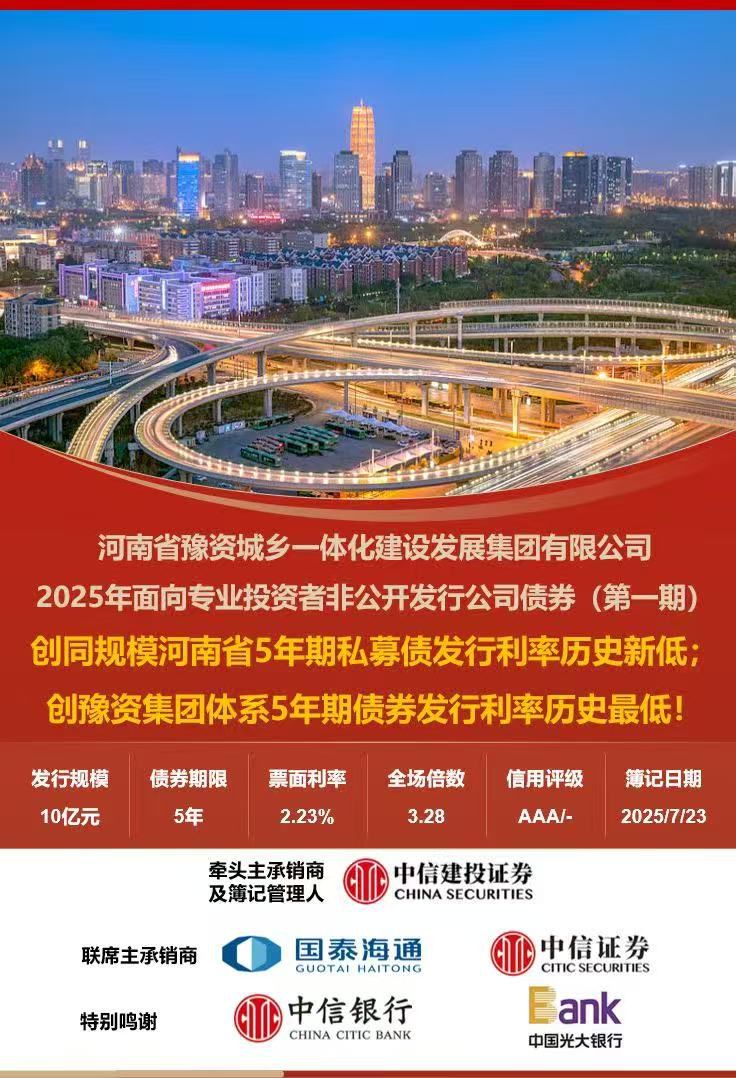 【大河财立方 记者 裴熔熔】7月24日,河南省豫资城乡一体化建设发展集团有限公司(以下简称豫资一体化公司)2025年面向专业投资者非公开发行公司债券(第一期)成功簿记发行,债券简称“25豫资01”,债券代码“259445.SH”。债券期限为5年期,最终发行规模10亿元,票面利率2.23%,认购倍数3.28倍。