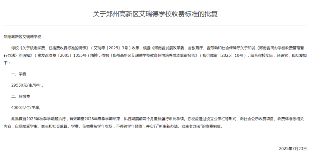 二、住宿费4000元/生/学年。此批复自2025年秋季学期起执行,有效期至2028年春季学期结束,执行期满前两个月重新履行审批手续。学校应通过设立公示栏等形式,向社会公示收费项目、收费标准等相关内容,自觉接受学生、家长和社会监督。学费、住宿费按学年收取,不得跨学年预收,并实行“新生新办法、老生老办法”的收费制度。