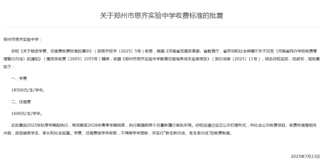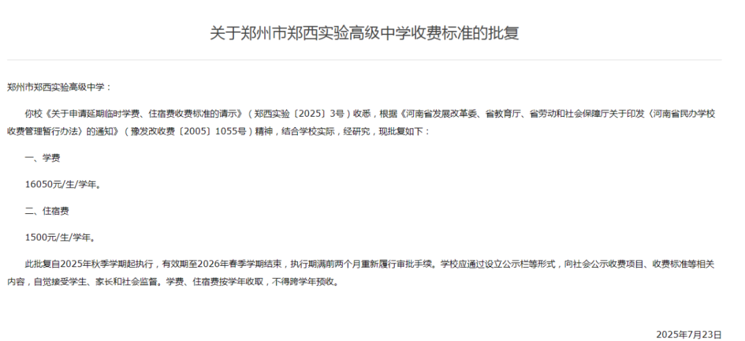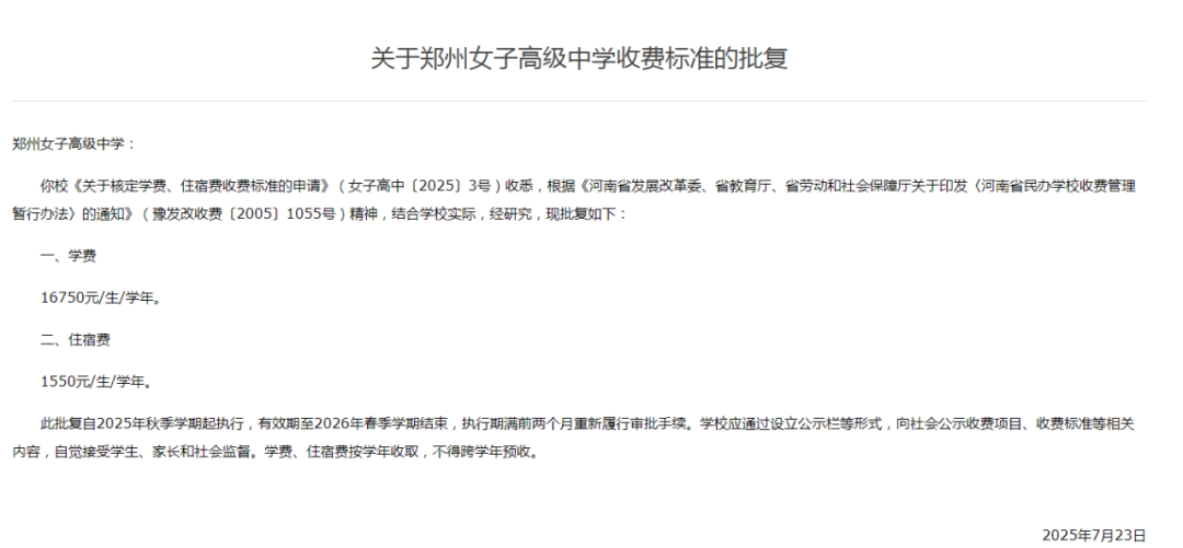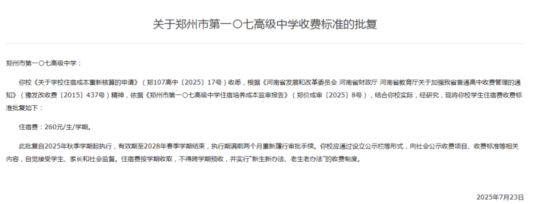 二、住宿费1500元/生/学年。此批复自2025年秋季学期起执行,有效期至2026年春季学期结束,执行期满前两个月重新履行审批手续。学校应通过设立公示栏等形式,向社会公示收费项目、收费标准等相关内容,自觉接受学生、家长和社会监督。学费、住宿费按学年收取,不得跨学年预收。