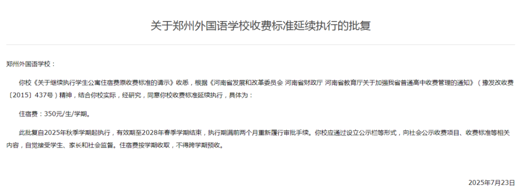 住宿费:350元/生/学期。此批复自2025年秋季学期起执行,有效期至2028年春季学期结束,执行期满前两个月重新履行审批手续。学校应通过设立公示栏等形式,向社会公示收费项目、收费标准等相关内容,自觉接受学生、家长和社会监督。住宿费按学期收取,不得跨学期预收。