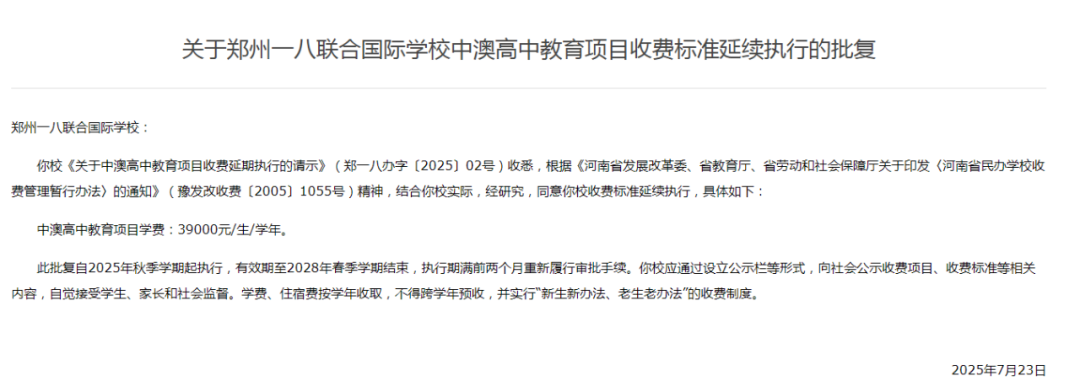中澳高中教育项目学费:39000元/生/学年。此批复自2025年秋季学期起执行,有效期至2028年春季学期结束,执行期满前两个月重新履行审批手续。学校应通过设立公示栏等形式,向社会公示收费项目、收费标准等相关内容,自觉接受学生、家长和社会监督。学费、住宿费按学年收取,不得跨学年预收,并实行“新生新办法、老生老办法”的收费制度。
