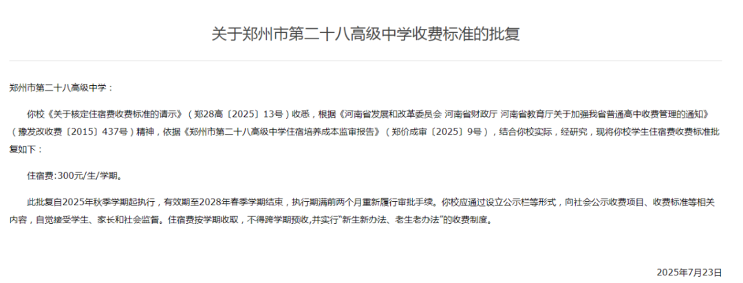 住宿费:300元/生/学期。此批复自2025年秋季学期起执行,有效期至2028年春季学期结束,执行期满前两个月重新履行审批手续。学校应通过设立公示栏等形式,向社会公示收费项目、收费标准等相关内容,自觉接受学生、家长和社会监督。住宿费按学期收取,不得跨学期预收,并实行“新生新办法、老生老办法”的收费制度。