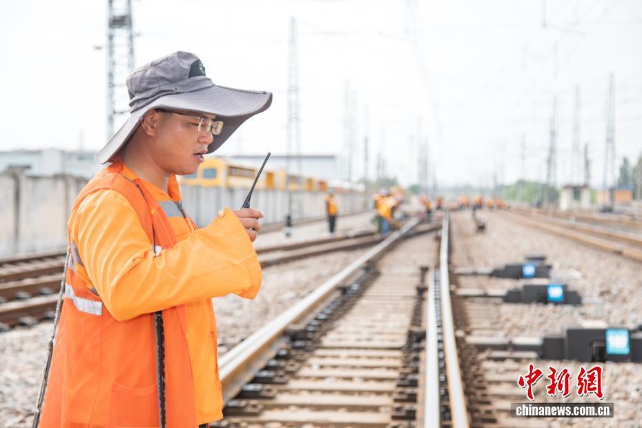 连日来,河南迎来大范围强对流天气。8月11日,中国铁路郑州局集团有限公司南阳工务段抢抓雨后设备提质“黄金期”,组织37名作业人员重点对南阳西站铁路线进行检修,消除连续降雨对线路设备的影响,为线路“舒筋通络”,确保列车运行安全畅通。图为安全防护员与驻站联控保障作业安全。王宽宁磊 摄