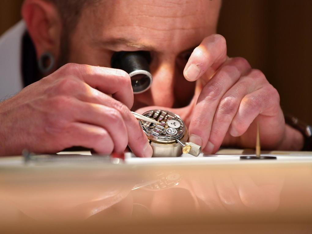 4月1日,在瑞士日内瓦举行的“钟表与奇迹”高级钟表展上,工匠展示钟表修复工艺。新华社记者连漪摄