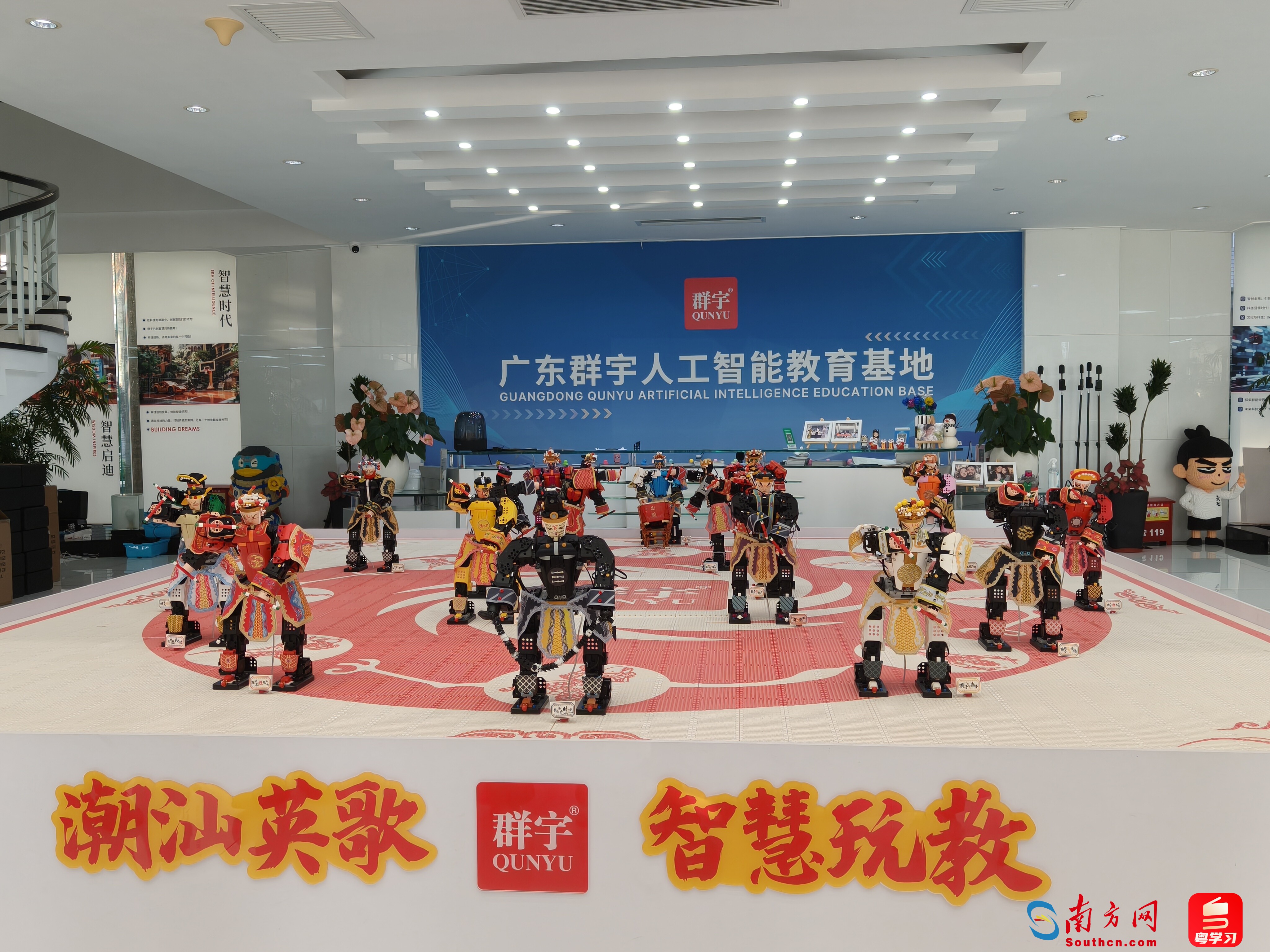 在广东群宇互动科技有限公司的展厅里,18台英歌舞机器人正随着节奏“起舞”,这些机器人的脸谱采用真人脸谱进行UV印制,戏服与道具则通过积木还原。这组英歌舞机器人的研发来自“80后”返乡创业青年、群宇互动公司总裁陈锐烽及其团队。这一灵感源泉,正是潮汕地区国家级非物质文化遗产代表性项目英歌舞。