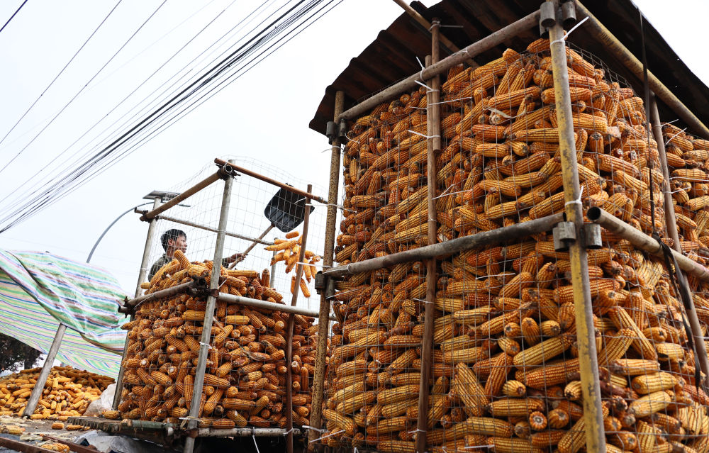 10月11日,山西省运城市新绛县泽掌镇泽掌村村民抓紧降雨暂停时段将收获的玉米上架晾晒。新华社发(高新生 摄)