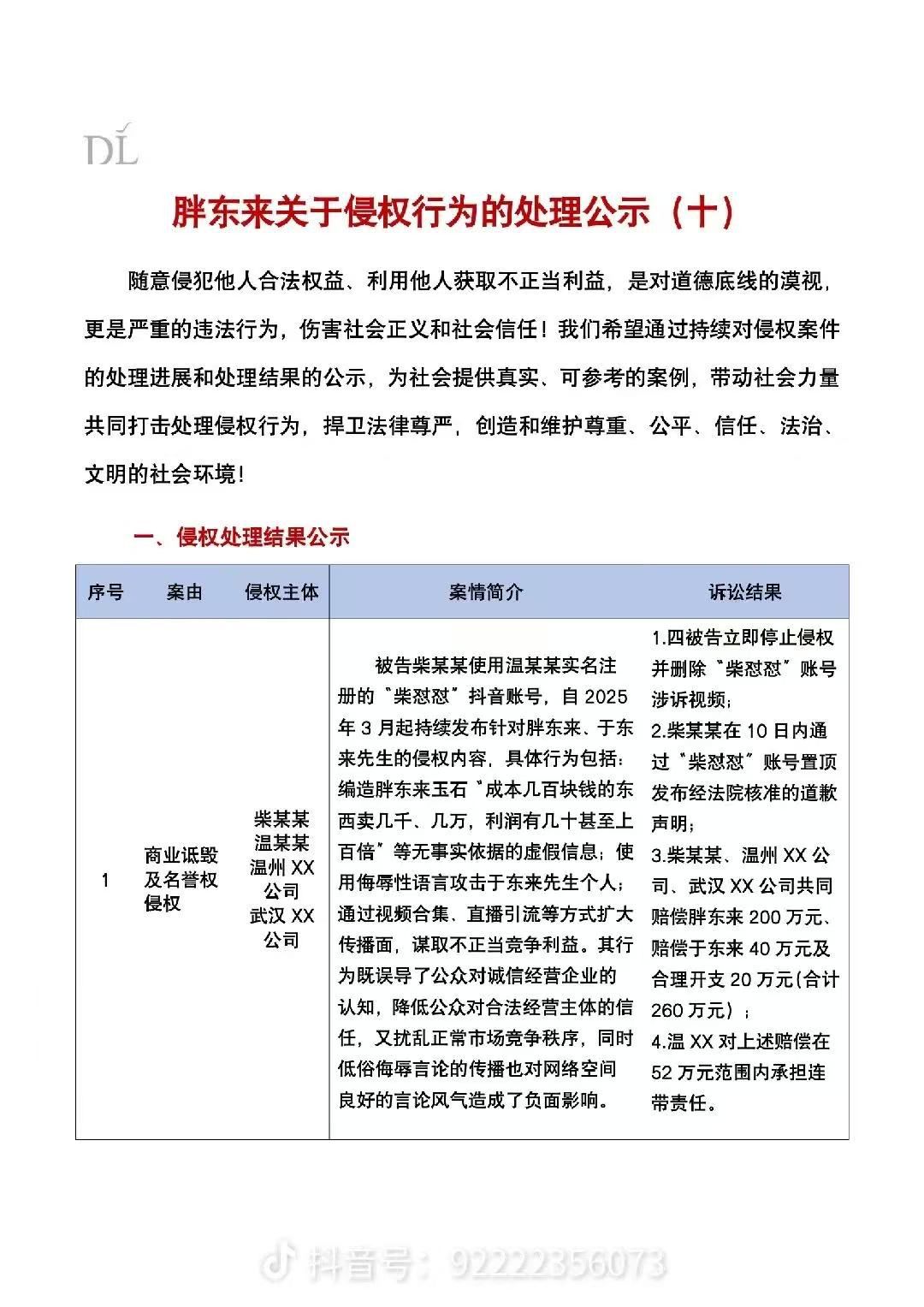 【大河财立方消息】11月11日,胖东来发布关于侵权行为的处理结果公示,其中关于“柴怼怼案”的诉讼结果为: