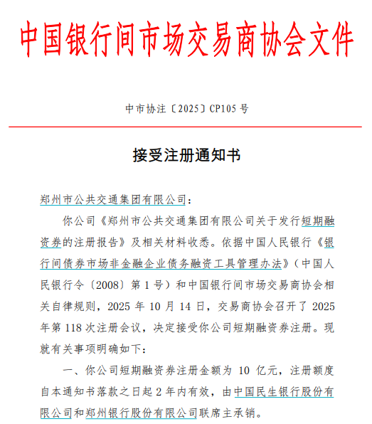 【大河财立方消息】11月13日消息,银行间交易商协会公告,接受郑州市公共交通集团短期融资券注册,金额为10亿元,注册额度自2025年10月28日起2年内有效,由中国民生银行和郑州银行联席主承销。