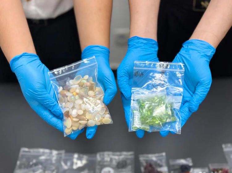 广州海关所属广州白云机场海关关员在对一架进境航班进行监管时,发现1名选择“无申报通道”通关的旅客携带的行李机检图像异常。海关关员随即进行拦截并开箱查验,在其行李中发现一批用塑料袋包装的宝石。宝石颜色和形状不一,有紫色、黄色、绿色等不同颜色,有水滴形、方形等各种形状。经送技术机构鉴定,确认上述宝石为祖母绿、红宝石、蓝宝石、欧泊、石榴石、碧玺等共计30类宝石,总数10973颗,重7.7千克。