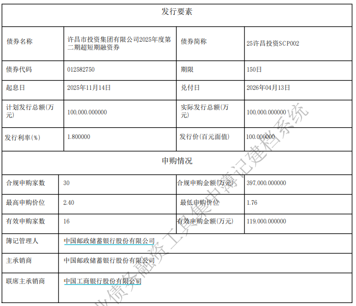 【大河财立方消息】11月14日,许昌市投资集团有限公司披露2025年度第二期超短期融资券发行情况。许昌投资集团10亿元超短融完成发行,发行利率1.8%,发行期限150日。起息日为2025年11月14日,兑付日为2026年4月13日。