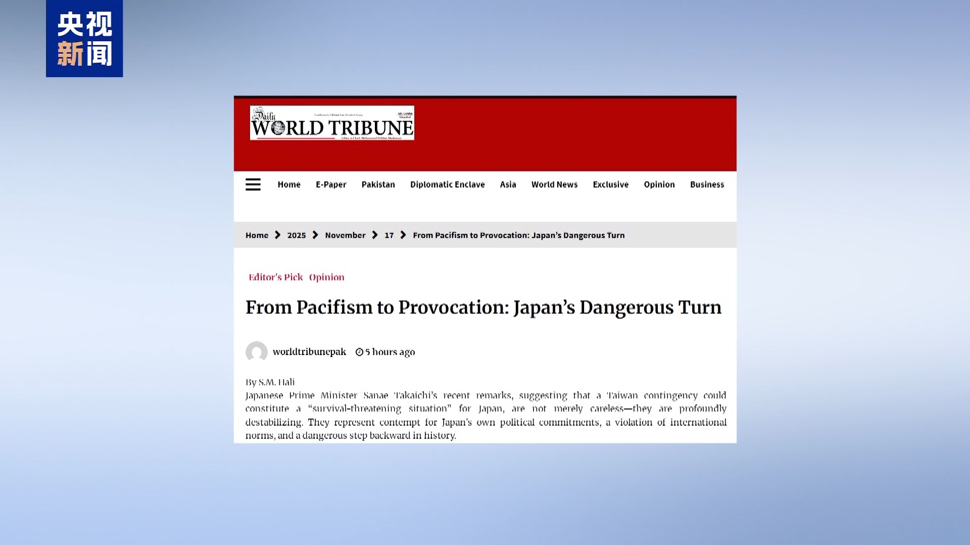 巴基斯坦国际问题专家苏尔坦·哈利在《世界论坛报》刊文指出,日本首相高市早苗的言论不仅违反了日本的政治承诺,也是一种危险的挑衅,威胁地区和平。亚洲承受不起重蹈军国主义覆辙的代价,日本必须牢记其承诺。
