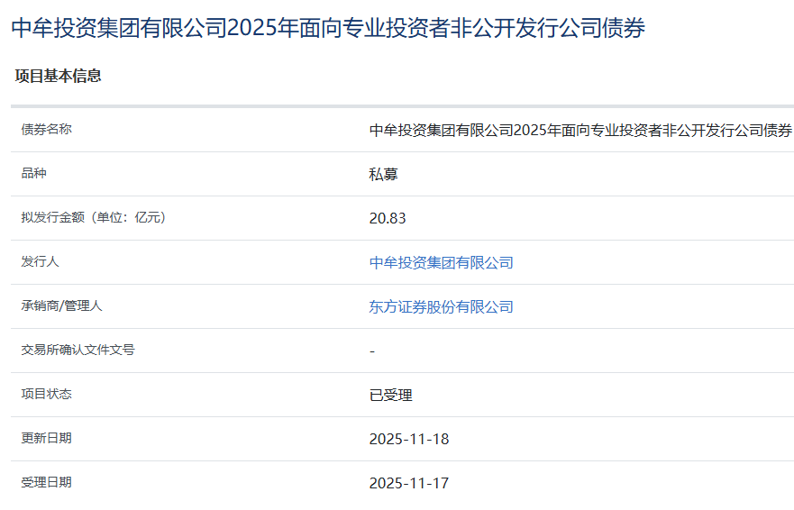 【大河财立方消息】11月18日,中牟投资集团有限公司2025年面向专业投资者非公开发行公司债券项目获上交所受理。本期债券拟发行金额20.83亿元,承销商/管理人为东方证券。
