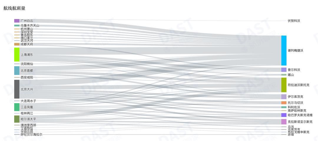 今年10月,中俄通航航班量TOP3航线分别为上海浦东-谢列梅捷沃(207班次)、北京大兴-谢列梅捷沃(169班次)、北京首都-谢列梅捷沃(124班次)。