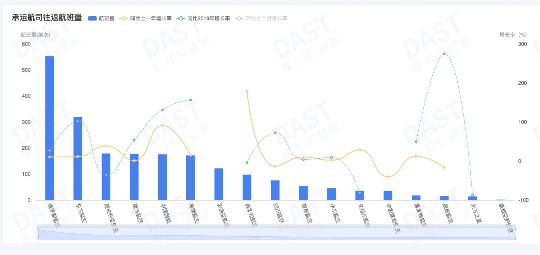 与2019年中俄往返航班量相比,成都航空增班超2倍,海航、国航、东航增班均超1倍。