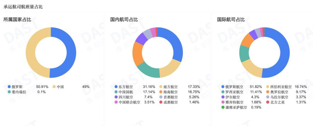 中俄航线承运航司中,国内航司占比49%;中俄航线承运航司TOP3分别为俄罗斯航空(554班次)、东航(320班次)、西伯利亚航空(179班次)。