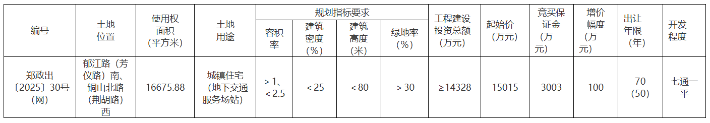 【大河财立方消息】11月19日,郑州市自然资源和规划局公告,决定以网上挂牌方式出让郑政出〔2025〕30号(网)地块的国有建设用地使用权。