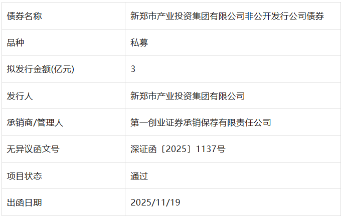 【大河财立方消息】11月19日,新郑市产业投资集团有限公司非公开发行公司债券项目获深交所通过。债券拟发行金额3亿元,承销商/管理人为一创投行。