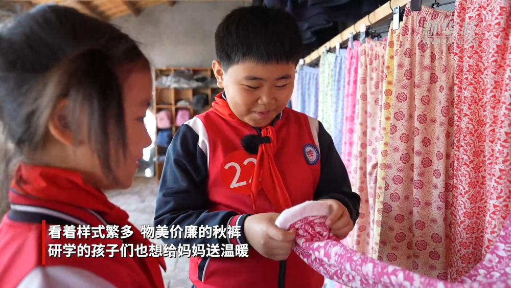 初冬时节,在山东省泰安市的网红旅游村王林坡村,各种秋裤的文化宣传语吸引游客驻足观看。看着样式繁多、物美价廉的秋裤,研学的孩子们也想给妈妈送温暖。